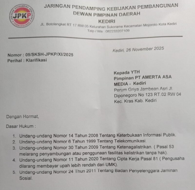 Surat klarifikasi JPKP kepada PT Amerta Asa Media tercatat bernomor 05/SKSH-JPKP/XI/2025 tertanggal 26 November 2025. Dalam surat tersebut, JPKP meminta penjelasan terkait sejumlah aspek legalitas dan kepatuhan perusahaan terhadap regulasi yang berlaku.