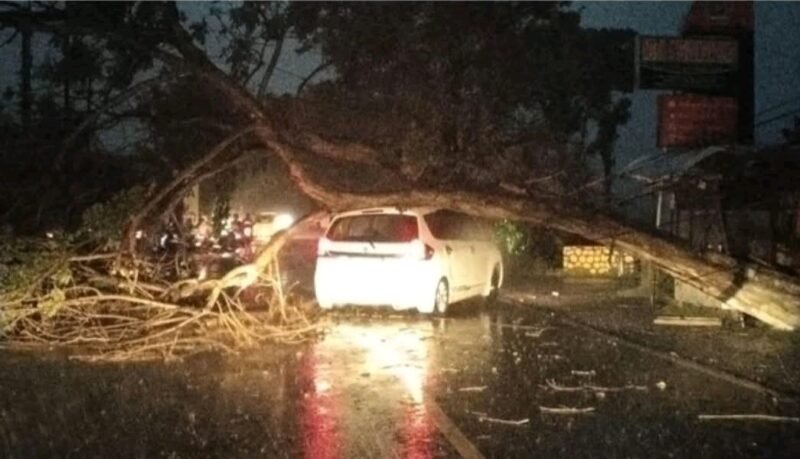 Tulungagung – Hujan deras disertai angin kencang menumbangkan sejumlah pohon besar di jalur utama Kecamatan Bandung, Tulungagung, Kamis (1/1/2026) petang. Sebuah minibus jenis Ertiga putih yang melintas tertimpa pohon, namun penumpang dan pengemudi selamat.
