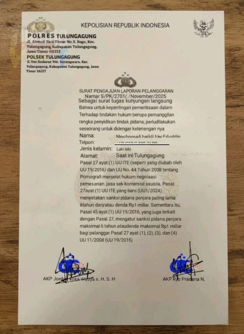 Tulungagung, Lumineerdaily.com – Gelombang penipuan dengan modus baru kembali menghampiri warga Tulungagung. Kali ini, para pelaku mencoba menampilkan diri seolah-olah memiliki kewenangan hukum. Sebuah surat yang disebut sebagai Surat Pengajuan Laporan Pelanggaran dikirimkan ke sejumlah warga, lengkap dengan tudingan pelanggaran yang tidak pernah mereka lakukan. Alurnya sederhana: menakuti, memancing panik, lalu membuka ruang untuk memeras.